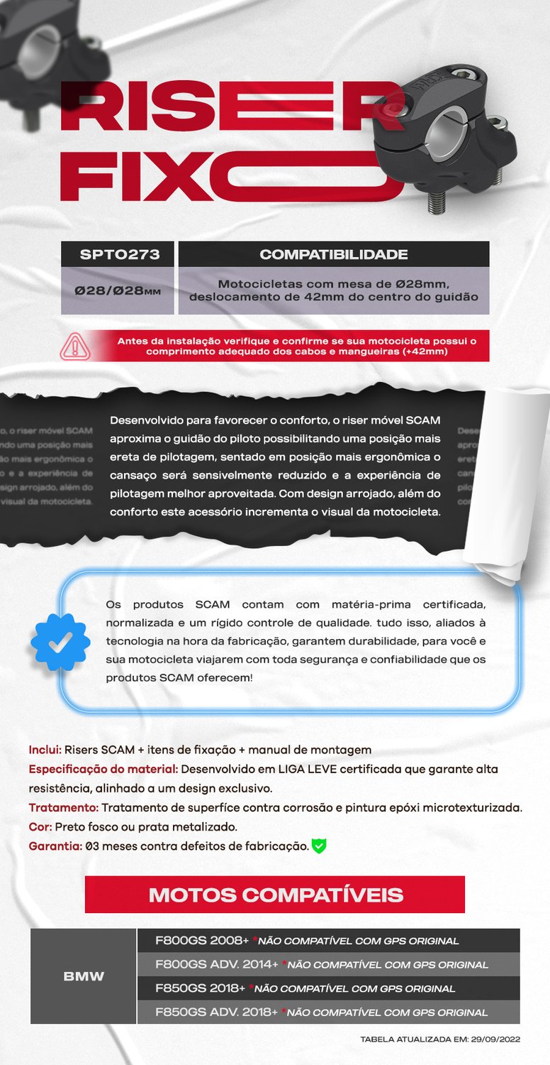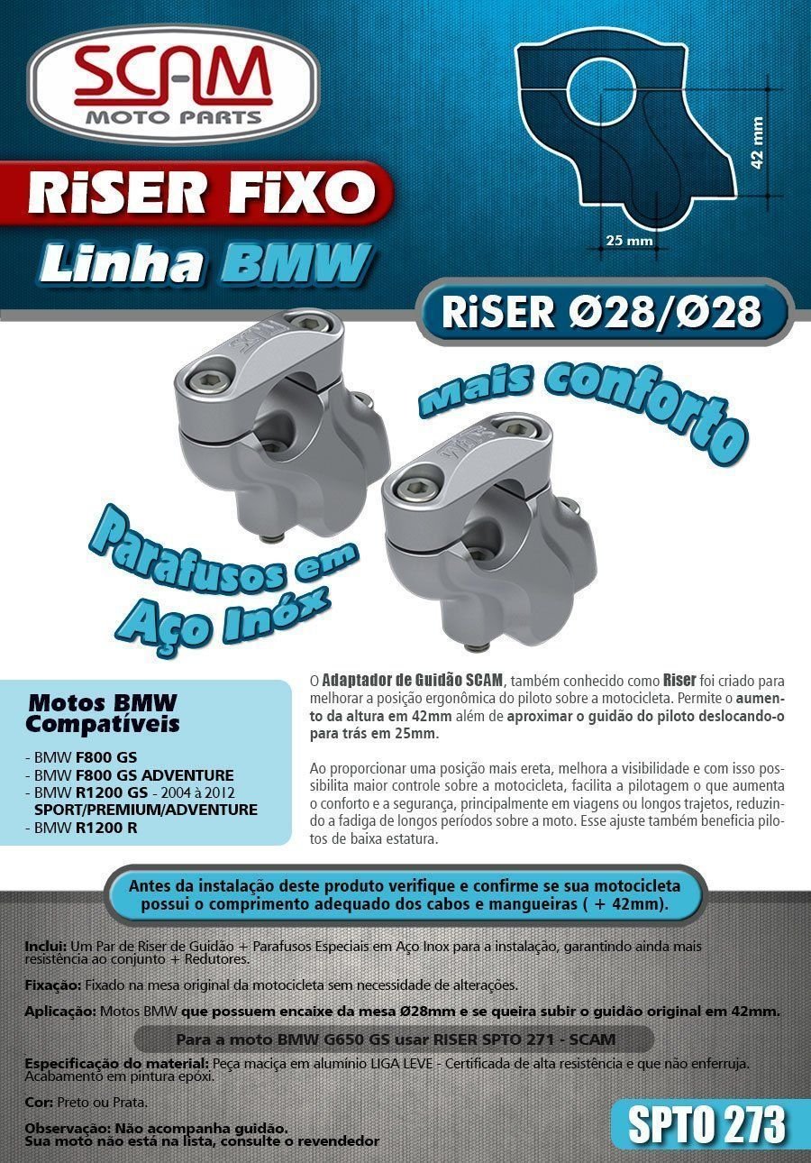 Motos BMW que possuem encaixe da mesa 28mm e se quer subir o guidão original em 42 mm, demais motos que possuam encaixe da mesa Ø28mm.
