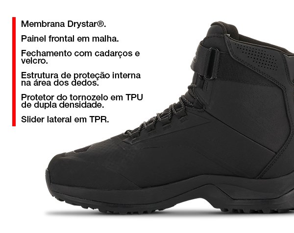 Painel frontal em malha para maior conforto e respirabilidade, A língua é em microfibra Nubuck para altos níveis de resistência à abrasão. Sistema tradicional de fechamento com cadarços de ajuste fácil e seguro; Sistema de fechamento lateral ajustável com Velcro para maior segurança;
