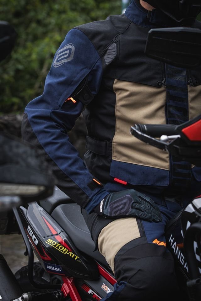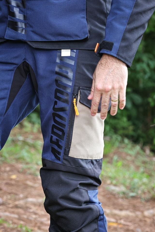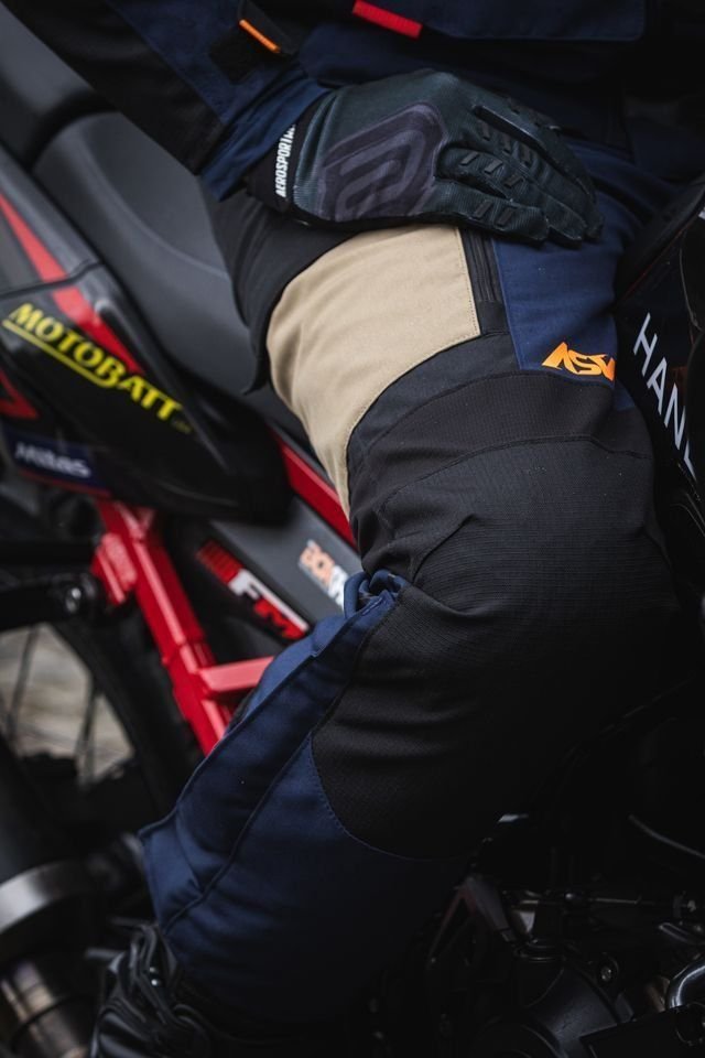 Logo ao lado, aberturas de ventilação direta elevam a sensação de conforto durante a pilotagem. A cintura conta com protetores CE nível 1, enquanto a região dos joelhos recebe proteção CE nível 2, ambas certificadas pela norma EN 1621-1. Ambos os protetores possuem ventilação e flexibilidade, o que melhora a respirabilidade e mantém a mobilidade.