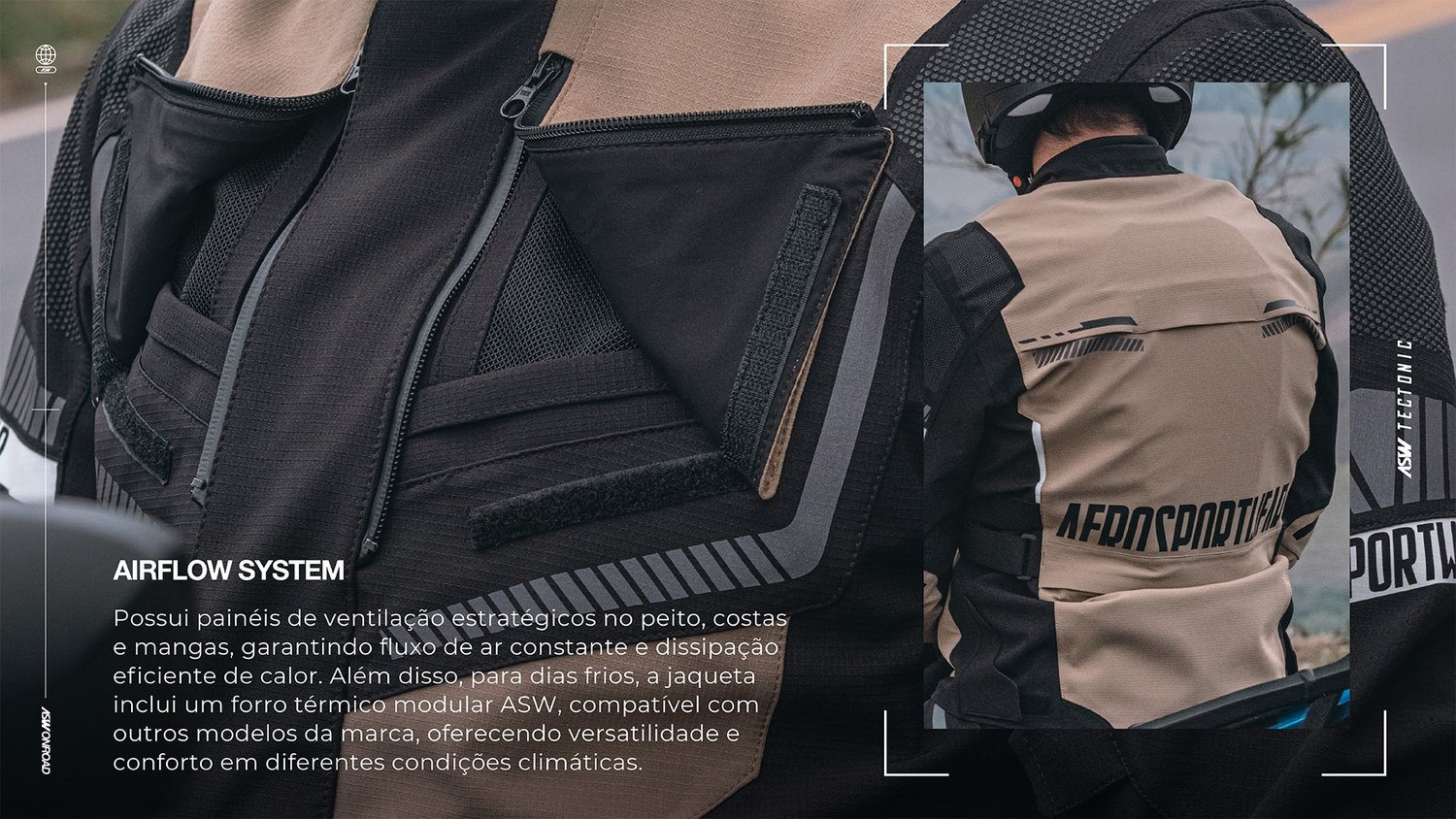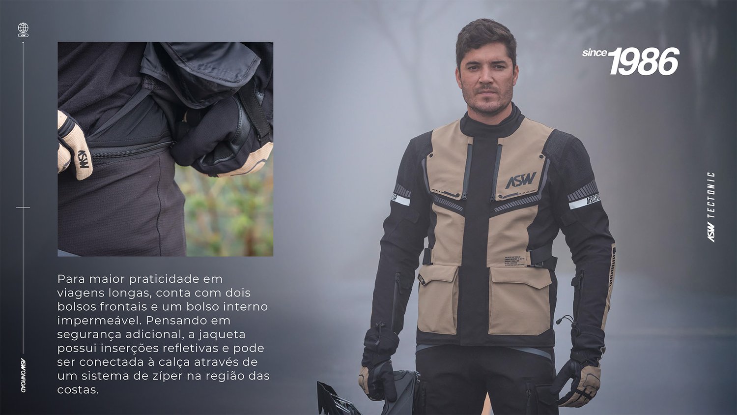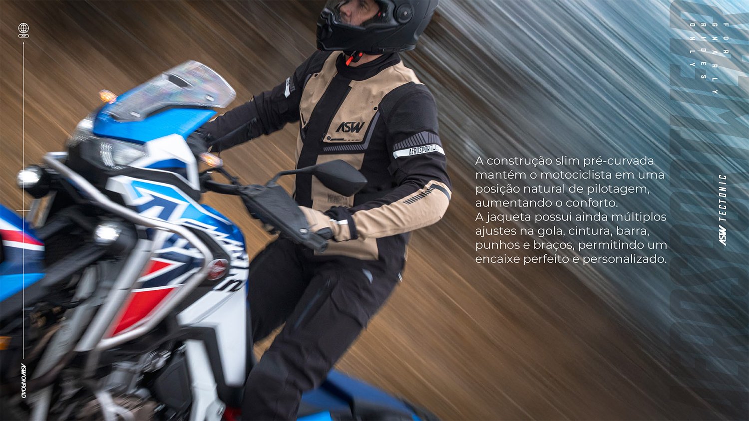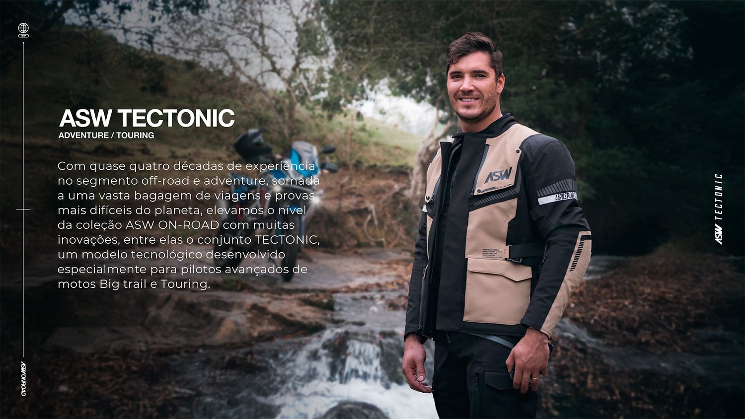 Com quase quatro décadas de experiência no segmento off-road e adventure, somada a uma vasta bagagem de viagens e provas mais difíceis do planeta, elevamos o nível da coleção ASW ON-ROAD com muitas inovações, entre elas o conjunto TECTONIC, um modelo tecnológico desenvolvido especialmente para pilotos avançados de motos Big trail e Touring.
