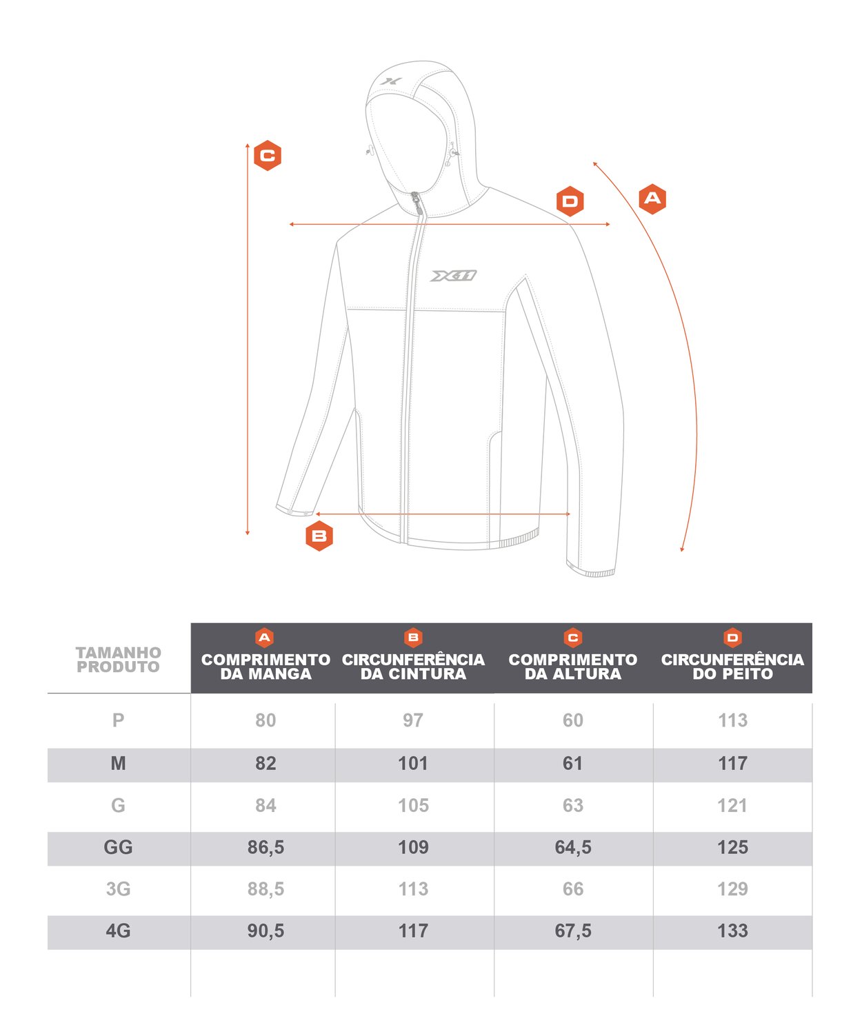 - Impressões refletivas no peito, cintura, nuca e capuz.