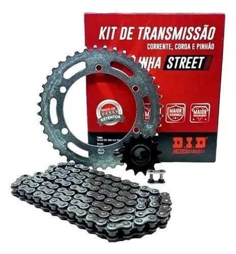 Fabricado no Brasil, o Kit de Transmissão Linha Street é composto por corrente, elo mestre de emenda, coroa e pinhão. Reúne em um único produto os elementos principais para a substituição correta do conjunto de transmissão.