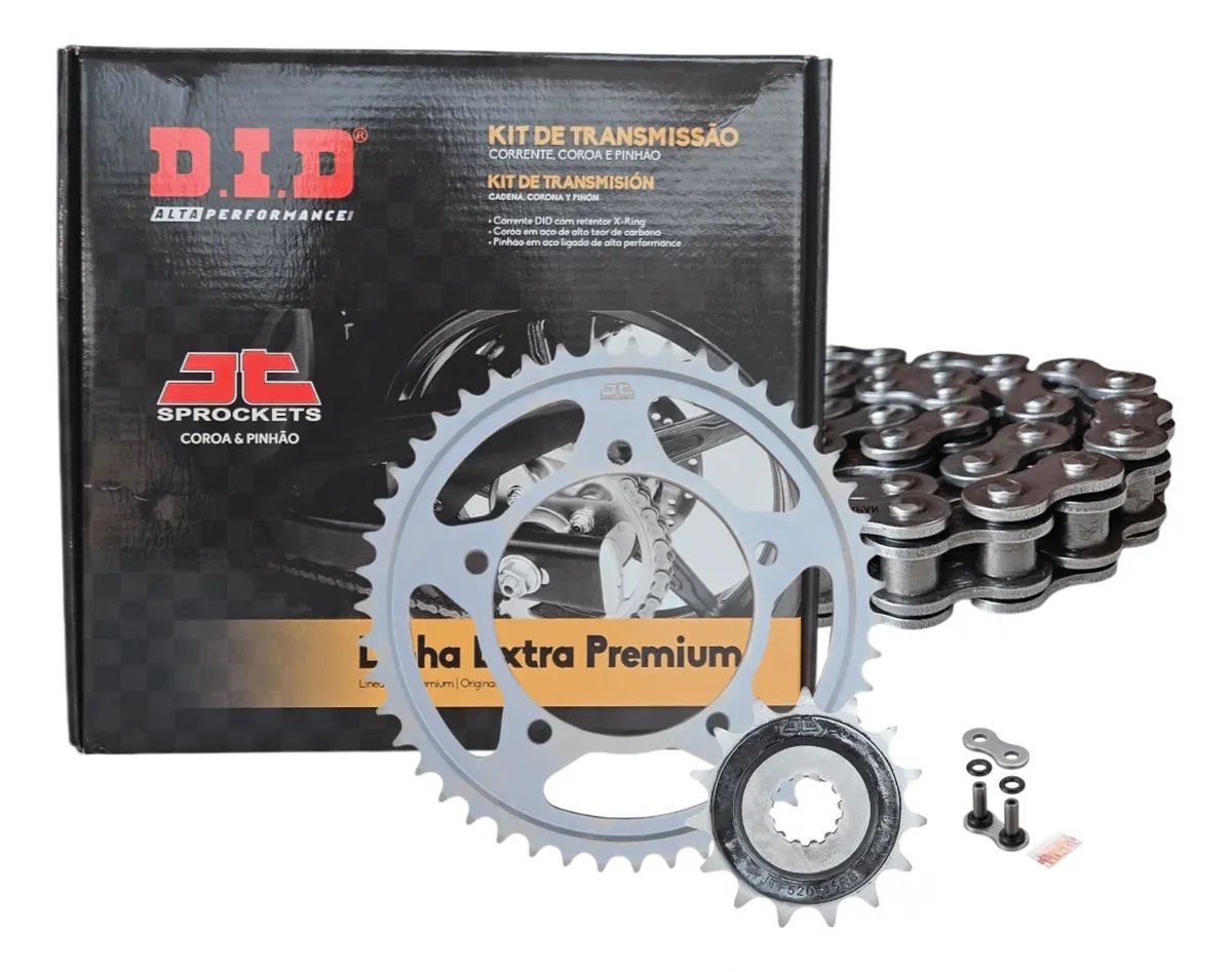 A Linha Extra Premium é composta por correntes DID Séries V0, VX e ZVM-X, produzidas no Japão. As coroas e pinhões JT são fabricadas com alto nível de qualidade com o que há de melhor em resistência e leveza. Todos os kits contam com tecnologia que os formam superiores aos originais de fábrica, tudo para garantir a melhor performance da sua moto.